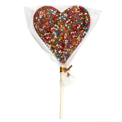 Milk chocolate heart shaped lollipop with a splash of rainbow 20g.
