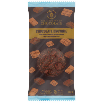 Ministry of Chocolate Brownie bar is milk couverture topped with choc cookie pieces!