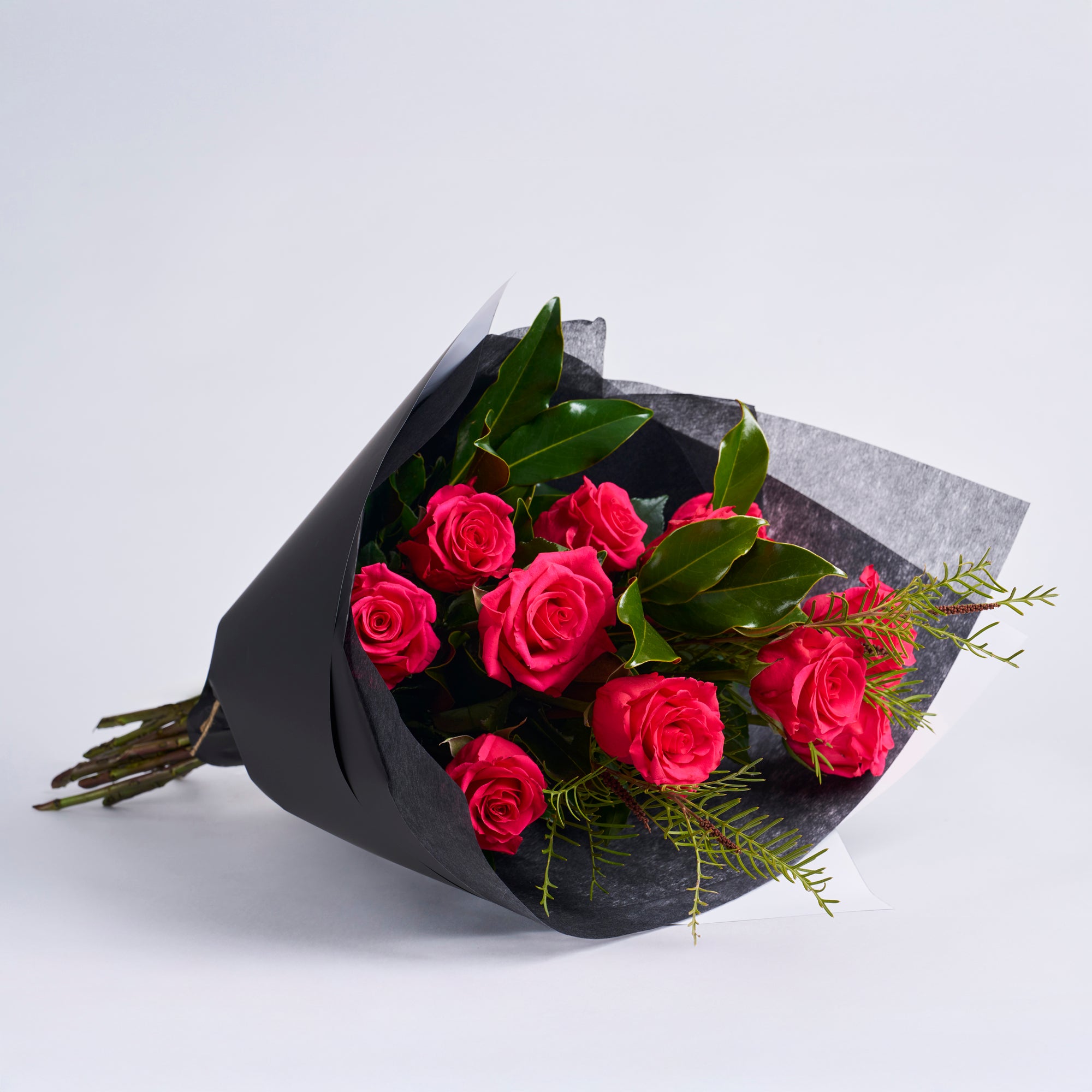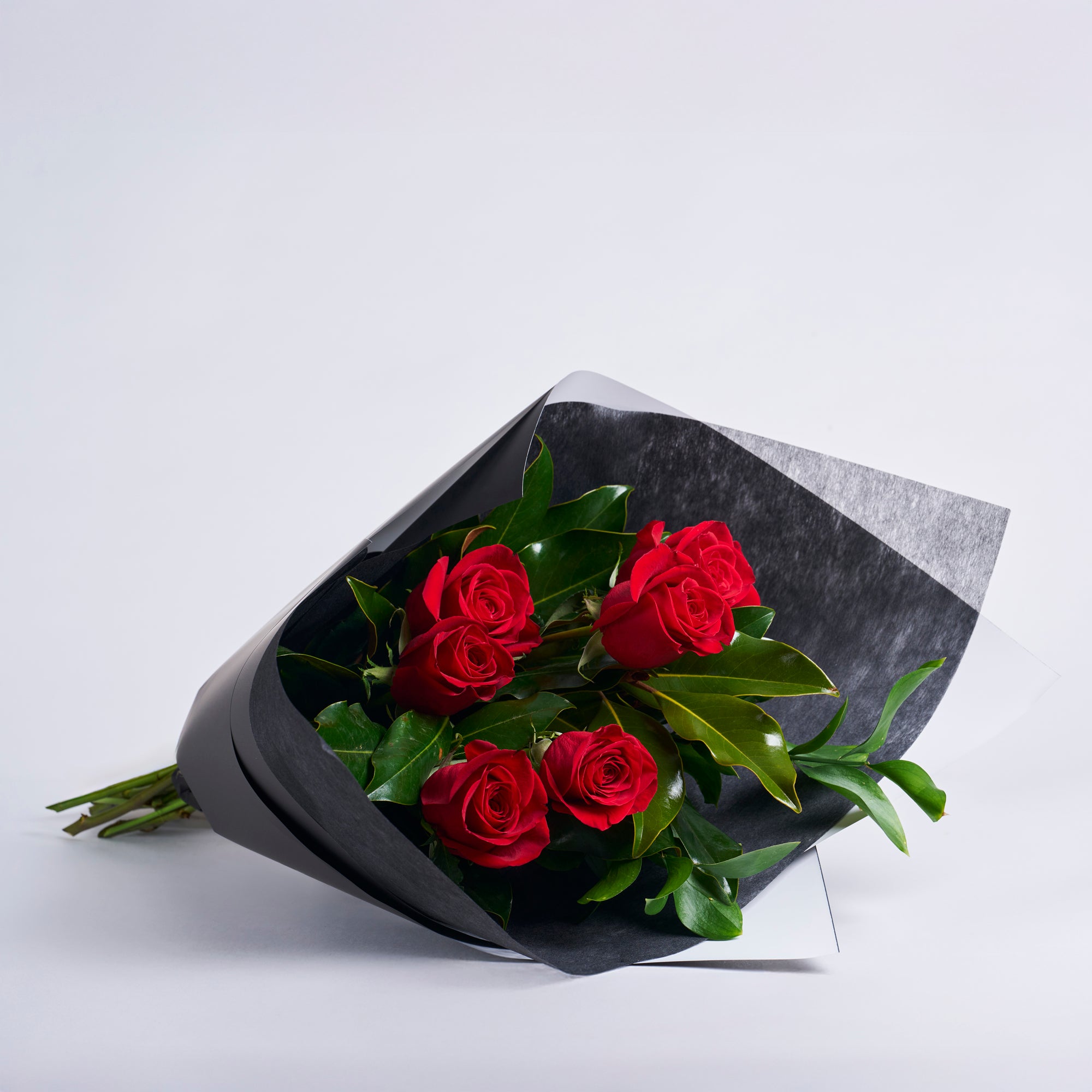 6 long-stemmed, premium red roses designed with lush foliage, beautifully presented