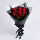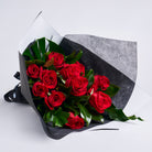 12 long-stemmed, premium red roses designed with lush foliage and beautifully presented